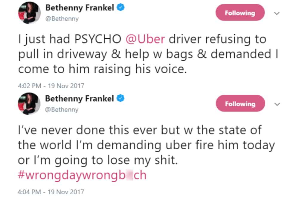 “I just had PSYCHO @Uber driver refusing to pull in driveway & help w bags & demanded I come to him raising his voice,” tweeted Bethenny in November 2017.