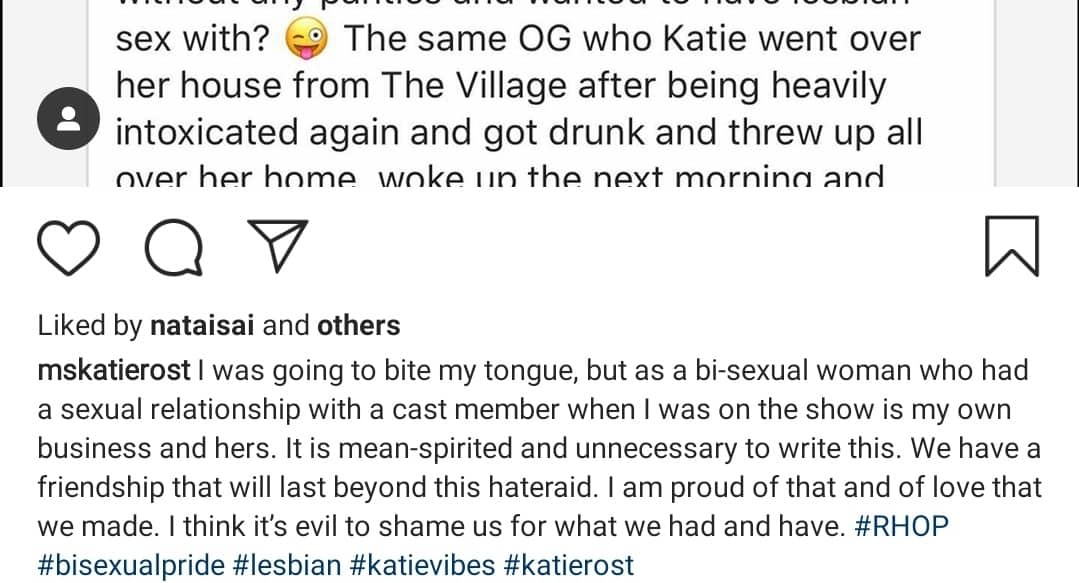 “I was going to bite my tongue, but as a bisexual woman who had a sexual relationship with a cast member when I was on the show — [it’s] my own business and hers,” Katie commented. “It is mean-spirited and unnecessary to write this.”