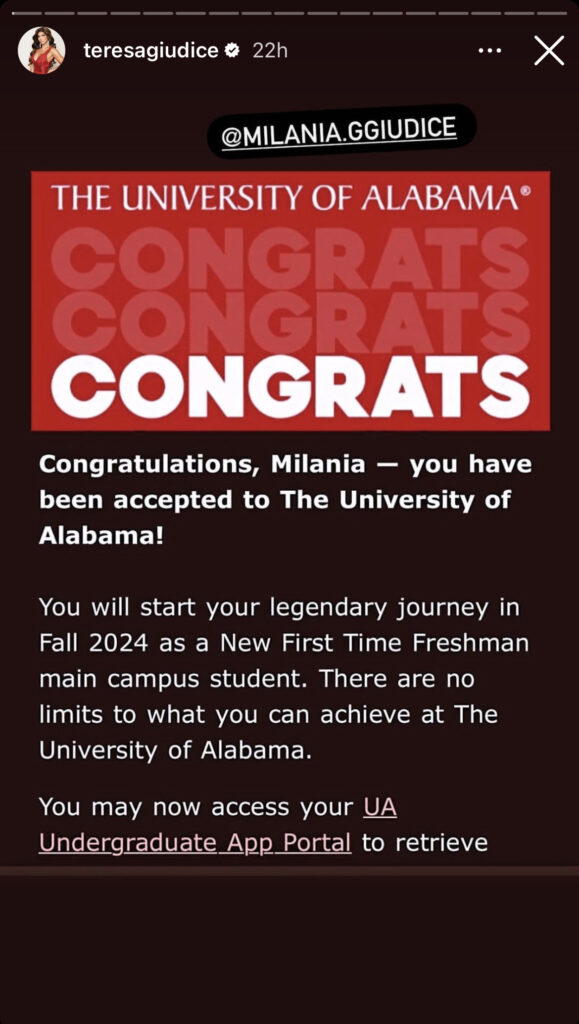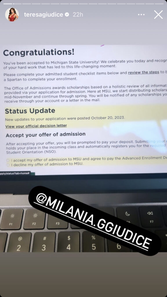 Around the same time, Teresa announced on Instagram that her daughter Milania was accepted to Michigan State University and the University of Alabama.