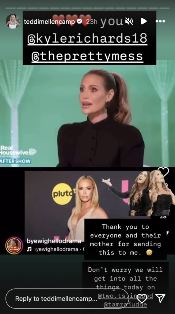 “❤️❤️❤️ you @KyleRichards18 [and Erika],” wrote Teddi over the clip. “Thank you to everyone and their mother for sending this to me. 🤣 Don’t worry we will get into all the things today on [my podcast].”