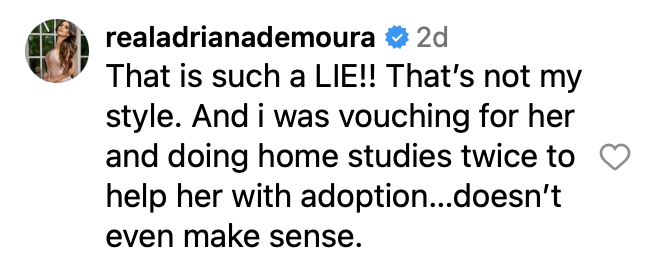 “That is such a Lie!! That’s not my style and I was vouching for her and doing home studies twice to help her with adoption,” wrote Adriana on a post from the AllAboutTRH podcast. “Doesn’t even make sense.”