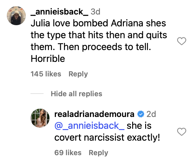 A fan then commented, “Julia love bombed Adriana she’s the type that hits then and quits them. Then proceeds to tell. Horrible.”