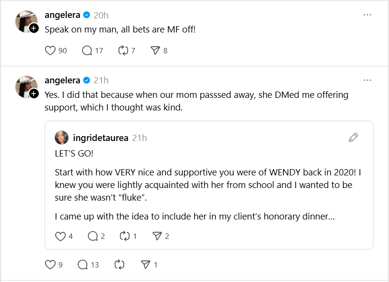 At one point, Angel’s sister Ingrid wrote, “LET’S GO! Start with how VERY nice and supportive you were of WENDY back in 2020! I knew you were lightly acquainted with her from school and I wanted to be sure she wasn’t ‘fluke’. I came up with the idea to include her in my client’s honorary dinner.”