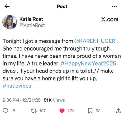 She said on December 31, “Tonight I got a message from @KARENHUGER. She had encouraged me through truly tough times. I have never been more proud of a woman in my life. A true leader. #HappyNewYear2026 divas, if your head ends up in a toilet.// make sure you have a home girl to lift you up, #katievibes.”
