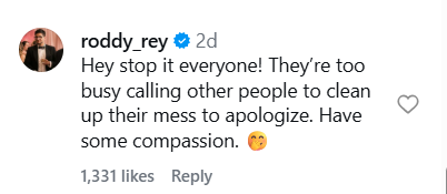 Rodrigo then wrote, “Hey stop it everyone! They’re too busy calling other people to clean up their mess to apologize. Have some compassion. 🤭.”