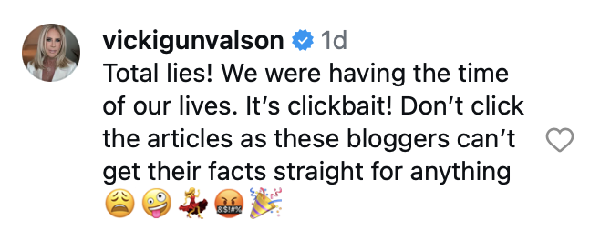 “Total lies!” wrote Vicki in a comment. “We were having the time of our lives. It’s clickbait! Don’t click the articles as these bloggers can’t get their facts straight for anything.”