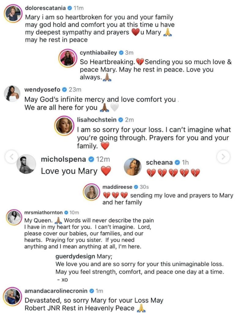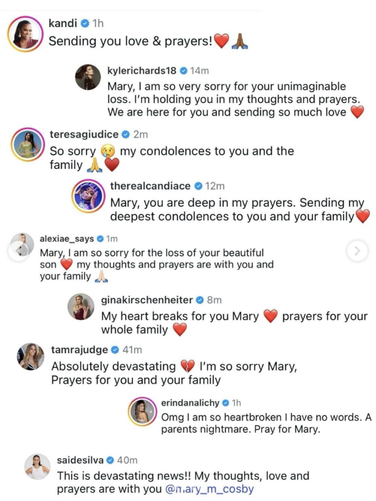 “Mary, I am so very sorry for your unimaginable loss. I’m holding you in my thoughts and prayers,” said Kyle Richards. “We are here for you and sending so much love.”