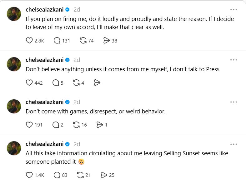 Chelsea then said, “Don’t come with games, disrespect, or weird behavior,” and added, “All this fake information circulating about me leaving Selling Sunset seems like someone planted it.”