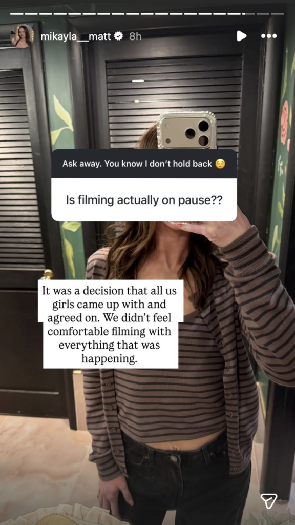 In a March 19 Instagram post, Mikayla shared who decided to pause filming.
