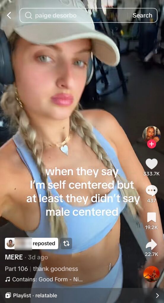 “When they say I’m self centered but at least they didn’t say male centered,” said the caption, reposted by Paige.