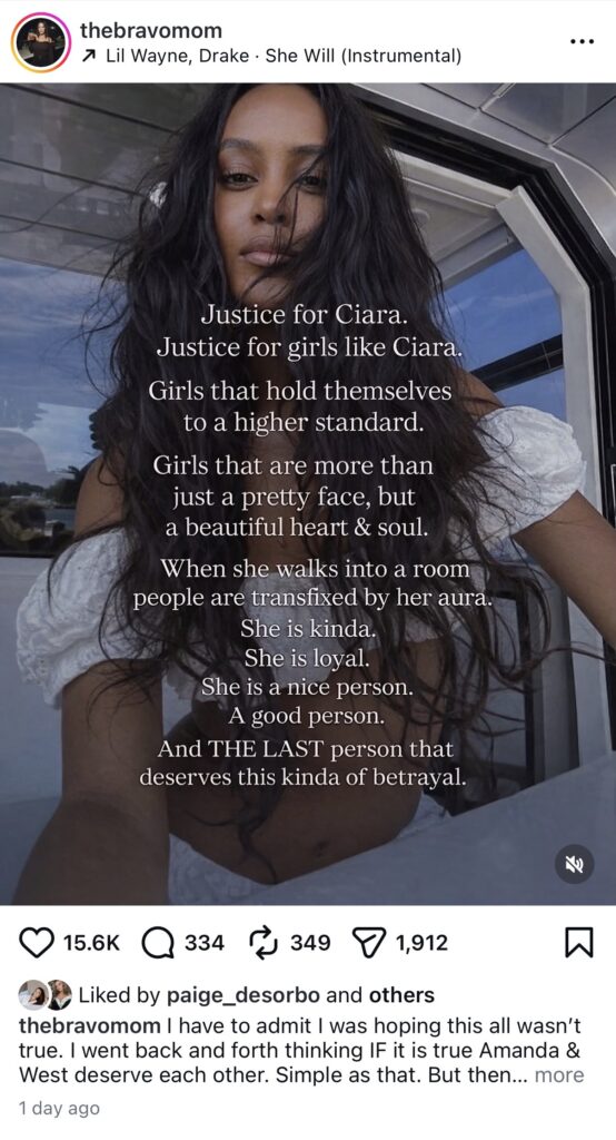 “Knowing that during spin the bottle West was jealous and pissed about Amanda kissing her husband that he USED Ciara as collateral to make Amanda jealous,” the caption continued. “West saying how much he misses Ciara, All the love and attention he was giving her. To play with a persons heart and soul like that is seriously deranged. He and Amanda do deserve each other. Ciara was smart to keep him at a distance. He never appreciated or respected her. I wish West & Amanda nothing but the worst.”