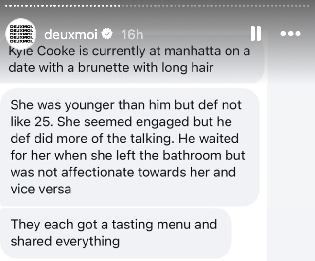 “Kyle Cooke is currently at Manhattan on a date with a brunette with long hair,” someone wrote. “She was younger than him but def not like 25.”