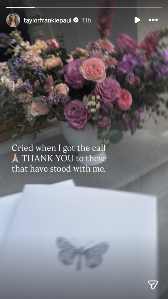 “[I] cried when I got the call,” wrote Taylor over a picture of a butterfly and flowers. “THANK YOU to those that have stood with me.”